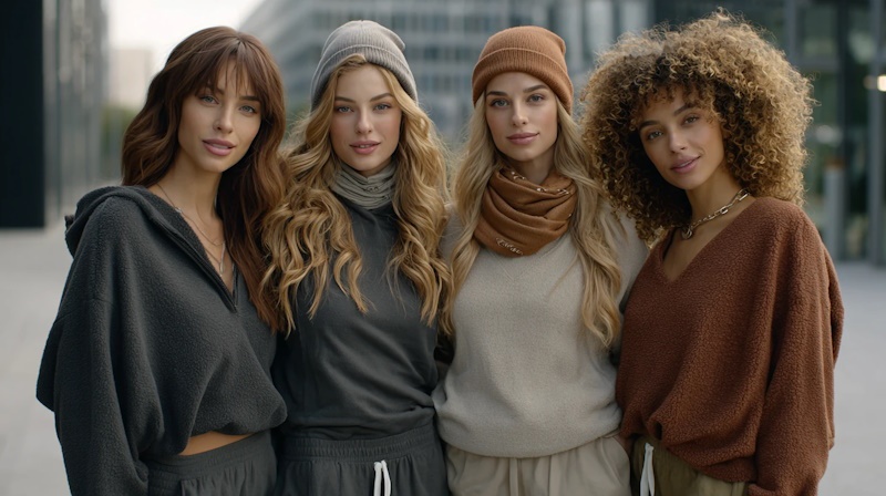 Є просте правило: якщо волосся створює сильний контраст з обличчям, кольори костюма можуть бути глибшими або чистішими. Якщо контраст невисокий, краще працюють приглушені, запилені відтінки та складні меланжі. Фактура теж важлива: фліс, футер, велюр, шерпа по-різному ловлять світло, а значить змінюють сприйняття кольору.